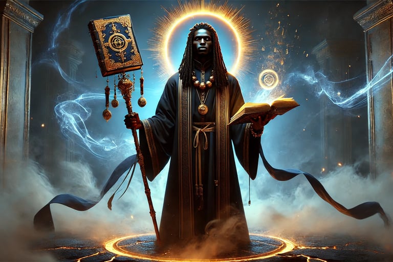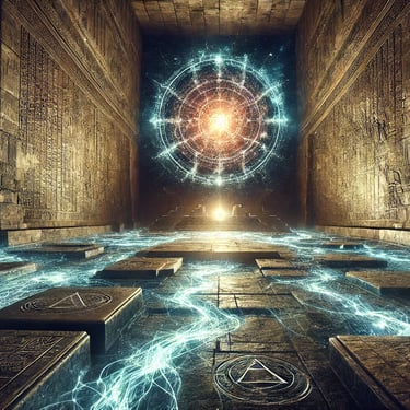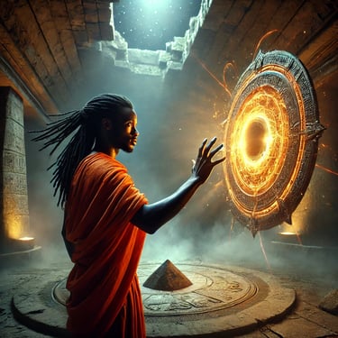 The Elder Monk led Akir into the sacred chamber beneath the Great Pyramid, where the energy of the Akashic Records flowed like a river of light and shadow. At the center of the chamber hovered a crown-shaped relic—the last remnant of the Darklight Halo, a fragment of its former power. Half of it shimmered with radiant light, while the other half swirled with the darkness of shadow.