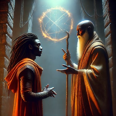 The portal shimmered in front of Akir, swirling with strands of light and shadow, beckoning him into the unknown. The Elder Monk stood silently behind him, staff in hand, his presence a grounding force. "This journey will require allies," the Elder Monk whispered. "And I believe you already know where to begin."